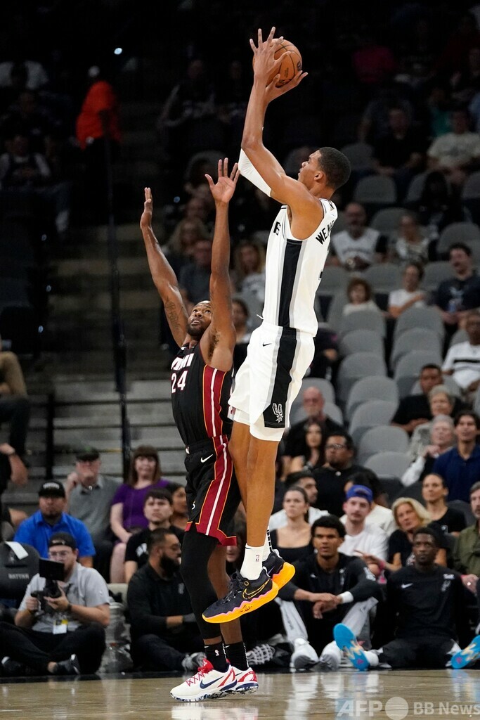 【10月14日 AFP】米プロバスケットボール(NBA)、サンアントニオ・スパーズ(San Antonio Spurs)のビクター・ウェンバンヤマ(Victor Wembanyama)は13日、マイアミ・ヒート(Miami Heat)とのプレシーズンゲームでデビュー2戦目に臨み、23得点の活躍を見せた。試合もスパーズが120-104で勝利した。