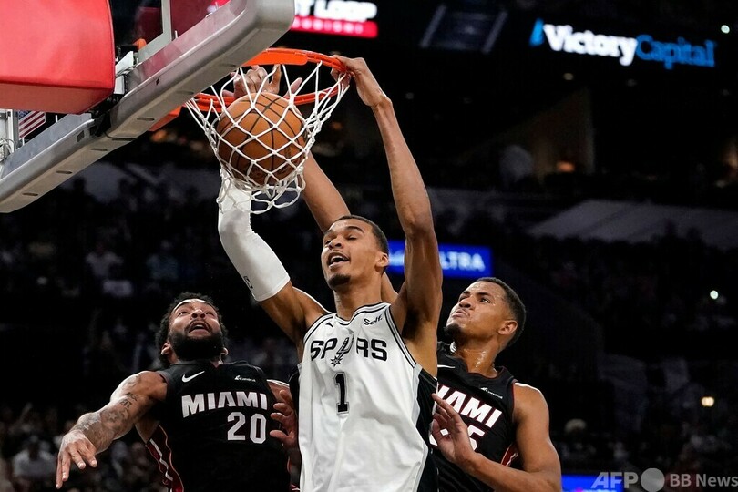 【10月14日 AFP】米プロバスケットボール(NBA)、サンアントニオ・スパーズ(San Antonio Spurs)のビクター・ウェンバンヤマ(Victor Wembanyama)は13日、マイアミ・ヒート(Miami Heat)とのプレシーズンゲームでデビュー2戦目に臨み、23得点の活躍を見せた。試合もスパーズが120-104で勝利した。