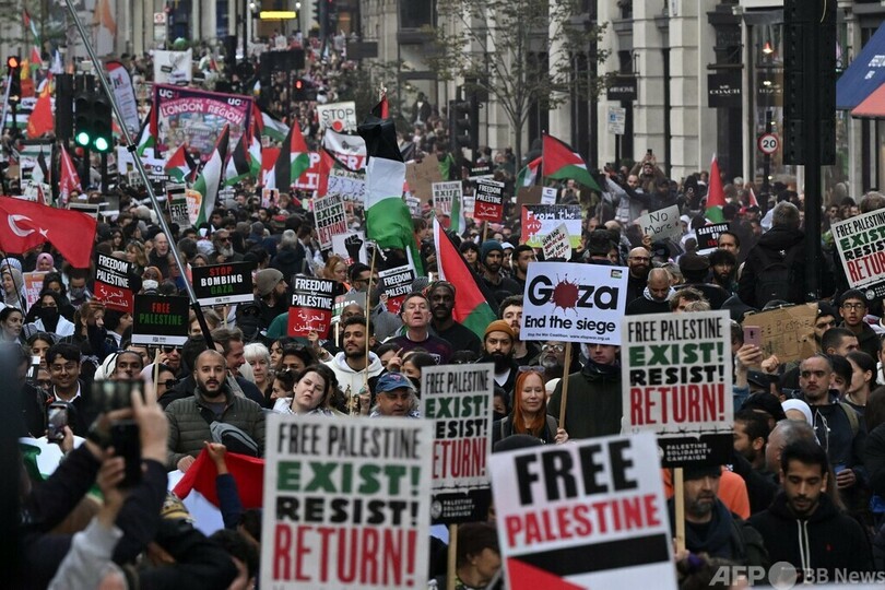 【10月15日 AFP】イスラエルとパレスチナ自治区ガザ地区(Gaza Strip)を実効支配するイスラム組織ハマス(Hamas)との武力衝突をめぐり、世界各地の都市で週末、抗議デモが行われた。