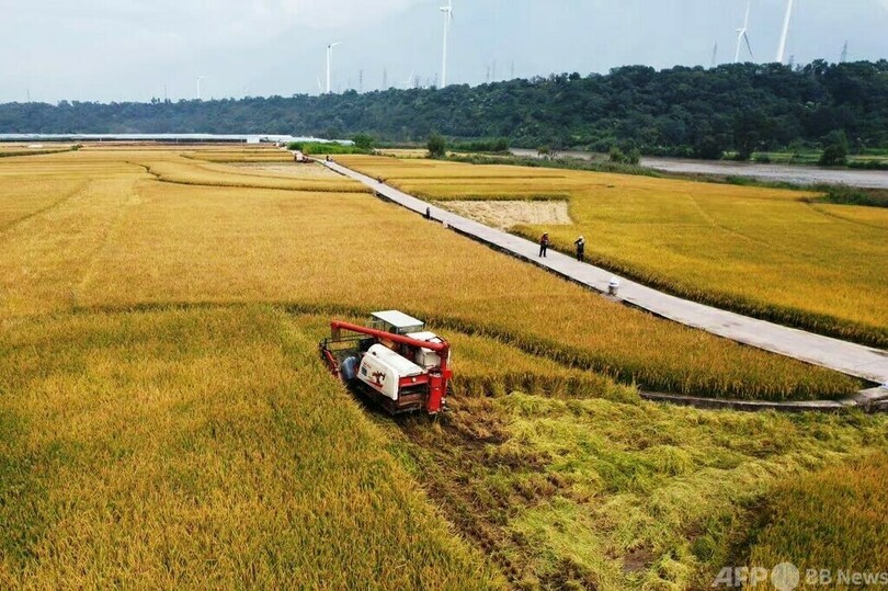 測定の際には、専門家グループが農業農村部のスーパーイネ生産量測定方法に基づいて、無作為に三つの水田を選んで機械刈り取りを行い、脱穀した後、水分を測り、異物を取り除き、重量を測定した結果、三つの水田の1ムー当たり生産量を1251.5キロと測定しました。そのうち、1号田の1ムー当たり生産量は1316.5キロ、2号田の1ムー当たり生産量は1249.4キロ、3号田の1ムー当たり生産量は1188.6キロでした。これにより、ハイブリッドイネの四半期ごとの1ムー当たり生産量の世界新記録が更新されました。(c)CGTN Japanese/AFPBB News