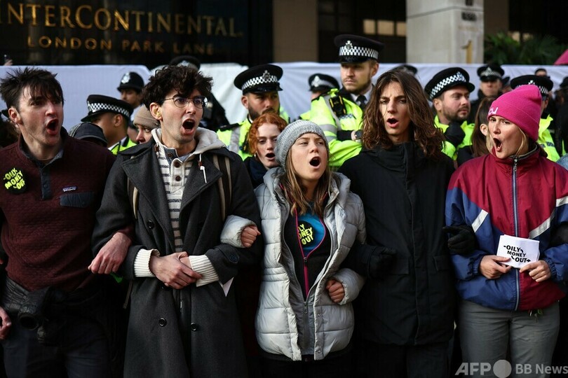 同ホテル前で行われた抗議デモに参加したトゥンベリさんは、記者団を前に、政治家と石油・ガス業界の代表の「密室合意」を非難。「これらの閉ざされた扉の向こうで、腰抜けの政治家たちが破壊的な化石燃料業界のロビイストと取引を行い、妥協している」と訴えた。