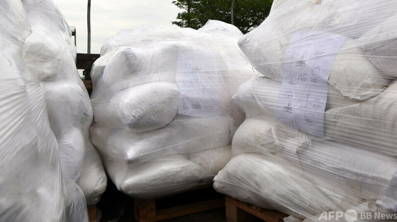 会見の会場には、押収されたコカインの一部が山積みにされていた。コカインはコメの入った袋に隠されていたという。(c)AFP