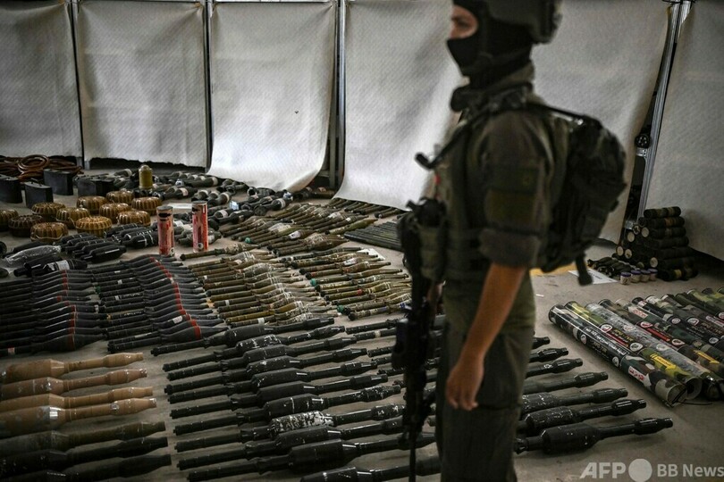 イスラエル軍は同日、ハマスに襲撃された南部のキブツ(生活共同体)で回収した武器を報道陣に公開。地雷やロケットランチャー、自家製ドローンなどとともに、イラン製の迫撃砲や北朝鮮製のロケットランチャーも展示された。