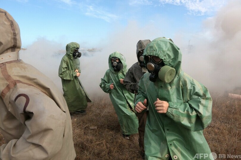 【10月29日 AFP】ロシアが併合したウクライナ南部クリミア(Crimea)半島の港湾都市セバストポリ(Sevastopol)で28日、「未来の司令官の学校」と銘打たれた軍事・愛国プログラムの訓練が行われ、ガスマスクや専用スーツを着用した少年少女らが参加した。