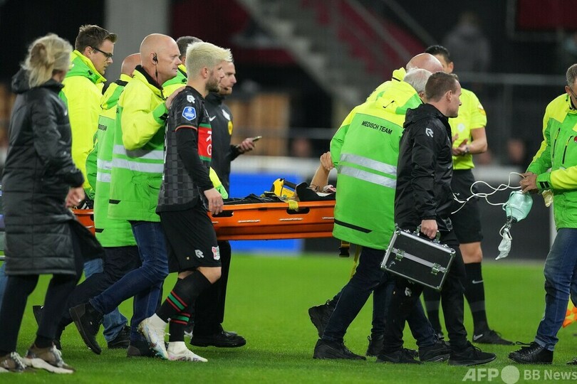 ドストは担架に乗せられてピッチを後にしたが、その際意識を取り戻してサポーターの声援に応えていた。中断時、ナイメヘンはドストの得点などで2-1とAZをリードしていた。(c)AFP