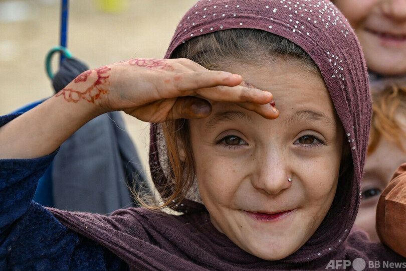 【11月11日 AFP】カメラに向かってポーズを取るアフガニスタン難民の少女。アフガニスタン難民が収容されたパキスタン・ランディコタル(Landi Kotal)の施設で。