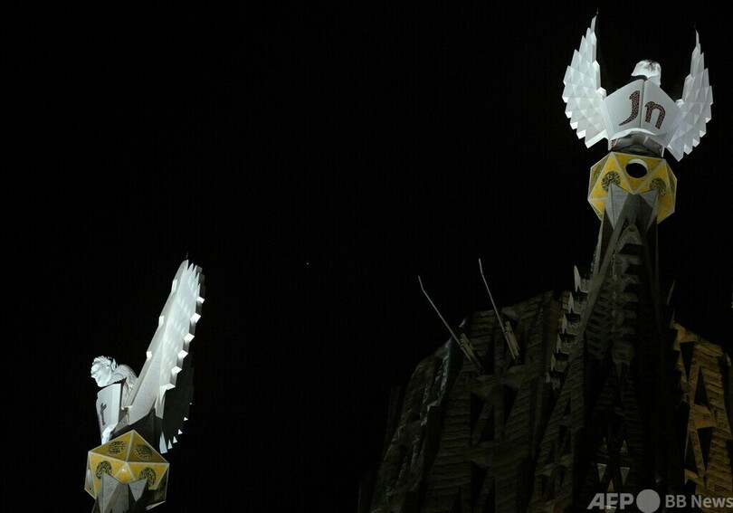 【11月13日 AFP】スペイン・バルセロナ(Barcelona)で12日、建築家アントニ・ガウディ(Antoni Gaudi)が設計したサグラダ・ファミリア(Sagrada Familia)教会が着工から141年を経て新たに2塔が完成したのを祝い、ライトアップが行われた。