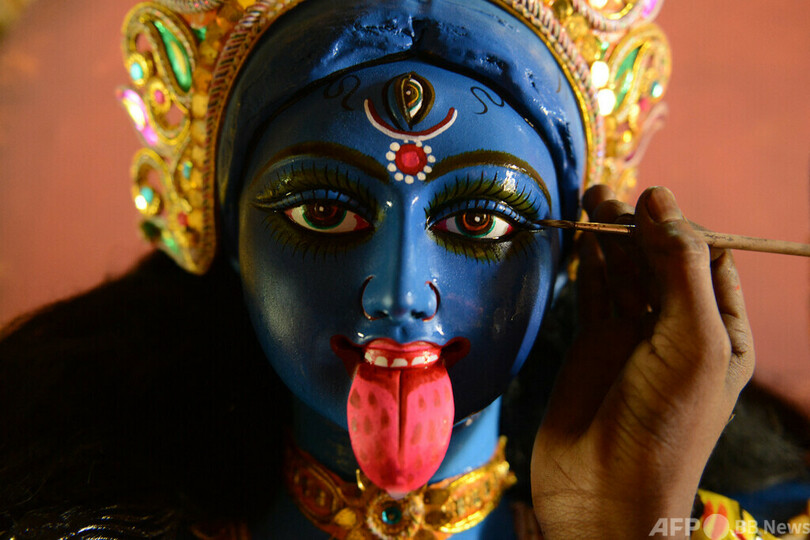 ヒンズー教で破壊と時を司る女神であるカーリーは通常、体が青く、4本の腕を持ち、長い舌を赤い口から突き出している姿で描かれる。