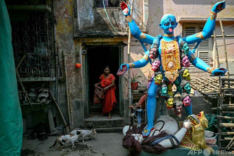 ヒンズー教で破壊と時を司る女神であるカーリーは通常、体が青く、4本の腕を持ち、長い舌を赤い口から突き出している姿で描かれる。