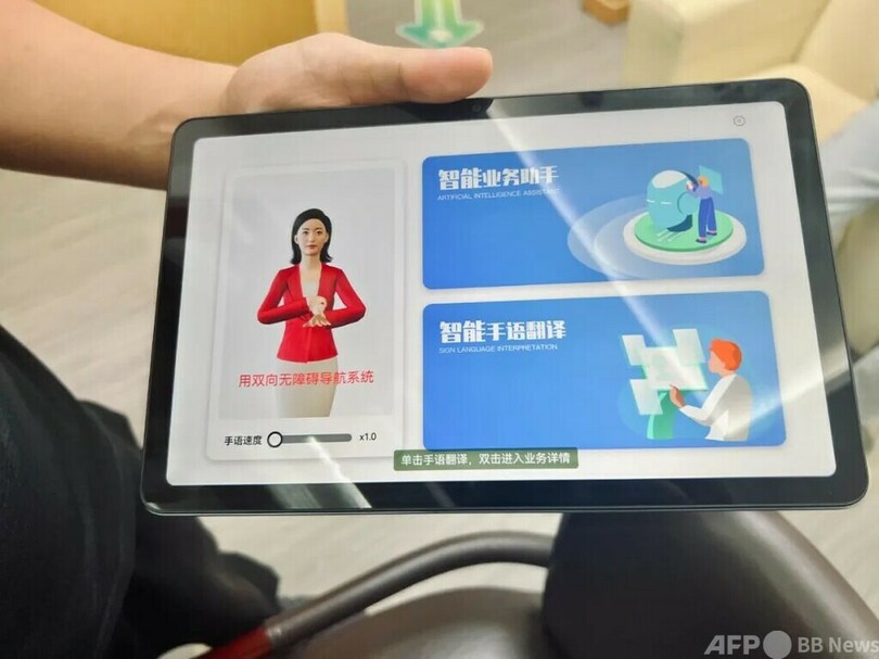 銀行のサービスシステムのほか、コミュニティでは同時手話会議システム、情報表示システム、手話教育とテストの一体化システムなどのデジタル化情報サービスプロジェクトが導入され、耳の不自由な人に仕事面、生活面で利便性を提供しています。(c)CGTN Japanese/AFPBB News
