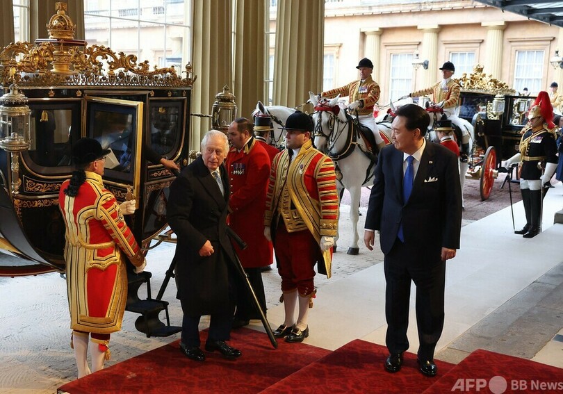 【11月22日 AFP】英国を国賓として訪問中の韓国の尹錫悦(ユン・ソンニョル、Yoon Suk-yeol)大統領夫妻は21日、チャールズ英国王(King Charles III)が主催するバッキンガム宮殿(Buckingham Palace)での晩さん会に出席した。