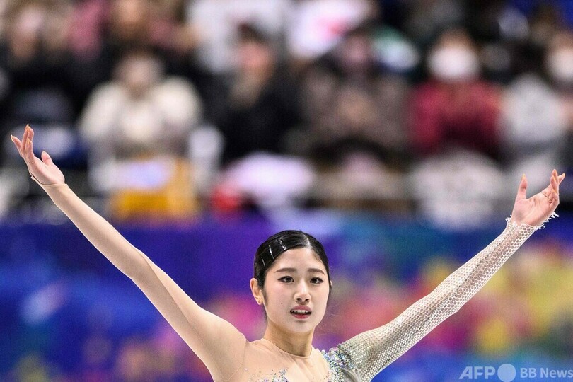 日本勢は三原舞依(Mai Mihara)が62.82点で4位、青木祐奈(Yuna Aoki)が58.28点で8位、樋口新葉(Wakaba Higuchi)が52.18点で11位につけた。(c)AFP