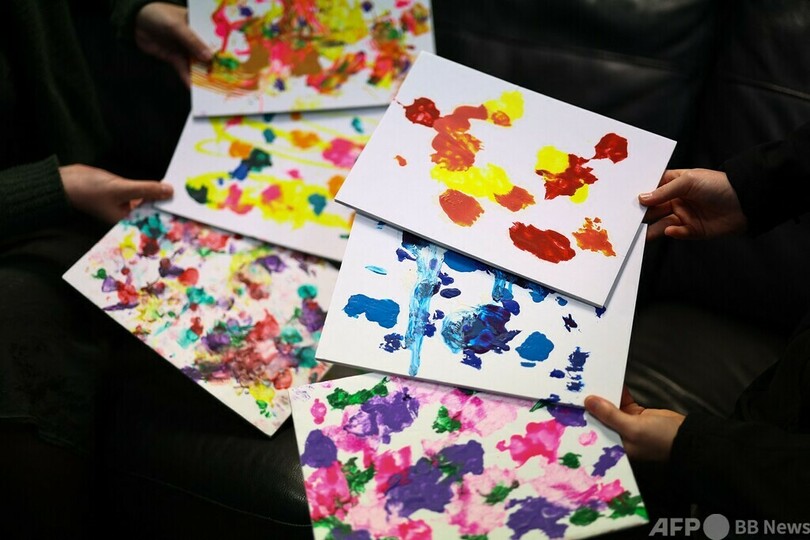 【12月7日 AFP】英イングランド西部ブリストル(Bristol)のブリストル動物保護センター(Bristol Animal Rescue Centre)で絵画作品を作る訓練を受ける元救助犬のアルバとロージー。作品は粗くて子どもっぽく、単純で雑に見えるかもしれないが、2匹は抽象画を再定義しようと懸命にキャンバスに向かい合っているのかもしれない。(c)AFP