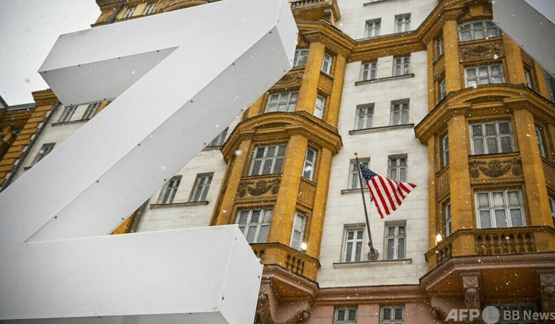 【12月1日 AFP】ロシアの首都モスクワの米大使館前に、ロシアのウクライナ侵攻を支持するシンボルとして使われているラテン文字「Z」と「V」の巨大看板が設置された。
