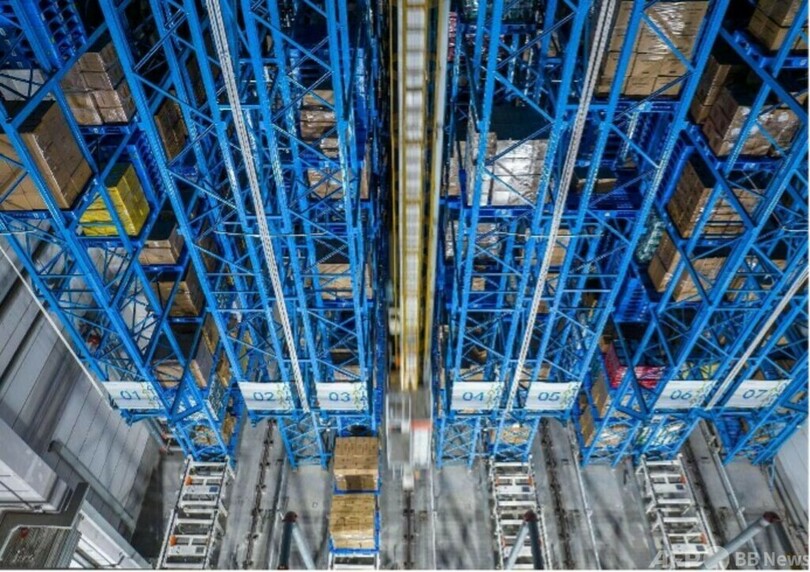 10階建ての倉庫内ではスマートクレーンが商品を次々に取り出して無人搬送車に乗せる。無人搬送車は仕分け台まで運ぶ。システムはすでに、各商品にとって最適な段ボール箱を指定していた。