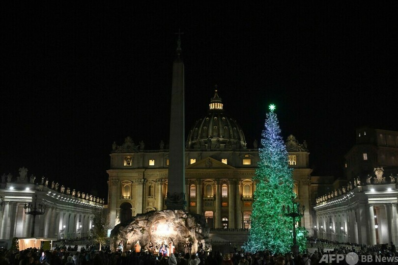 【12月10日 AFP】バチカンのサンピエトロ広場(St. Peter's Square)で9日、恒例のクリスマスツリーの点灯式が行われた。イエス・キリスト降誕の場面を再現した等身大のジオラマ(プレゼーぺ)も設置された。