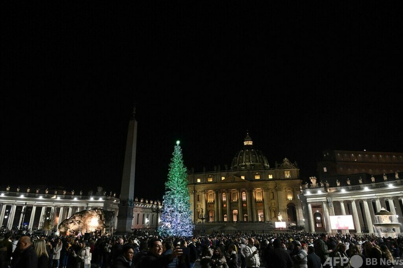 【12月10日 AFP】バチカンのサンピエトロ広場(St. Peter's Square)で9日、恒例のクリスマスツリーの点灯式が行われた。イエス・キリスト降誕の場面を再現した等身大のジオラマ(プレゼーぺ)も設置された。