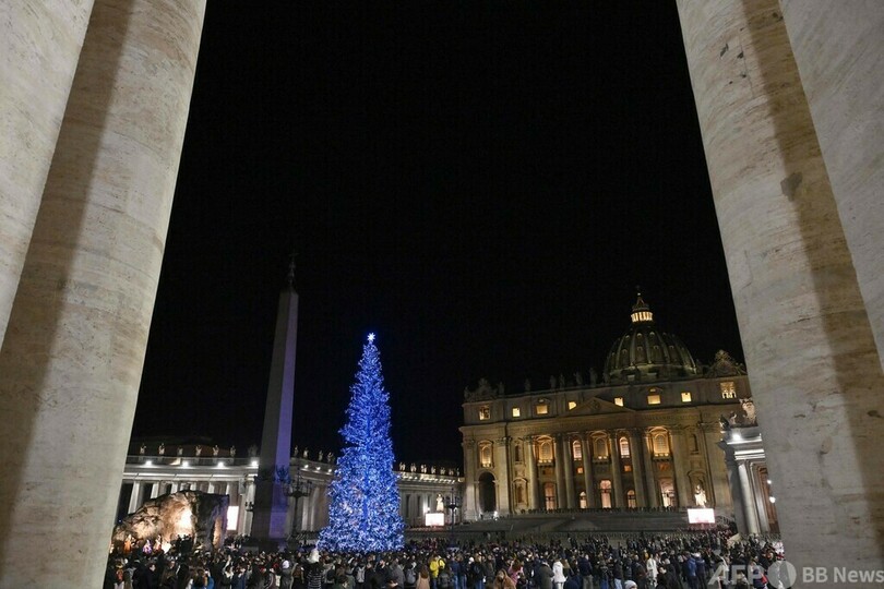 【12月10日 AFP】バチカンのサンピエトロ広場(St. Peter's Square)で9日、恒例のクリスマスツリーの点灯式が行われた。イエス・キリスト降誕の場面を再現した等身大のジオラマ(プレゼーぺ)も設置された。
