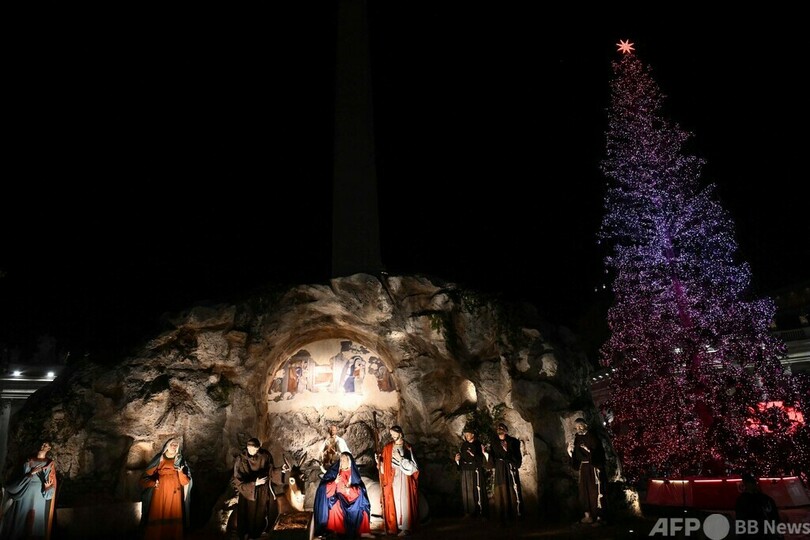 【12月10日 AFP】バチカンのサンピエトロ広場(St. Peter's Square)で9日、恒例のクリスマスツリーの点灯式が行われた。イエス・キリスト降誕の場面を再現した等身大のジオラマ(プレゼーぺ)も設置された。