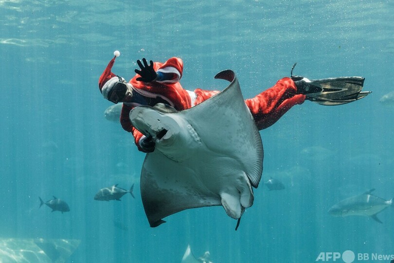 水族館のセンゾ・グメデさんらが扮(ふん)するサンタクロースが、水中でエイなど海洋生物にプレゼントの餌を与えた。