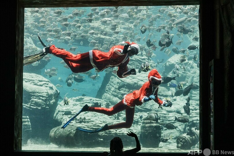 水族館のセンゾ・グメデさんらが扮(ふん)するサンタクロースが、水中でエイなど海洋生物にプレゼントの餌を与えた。