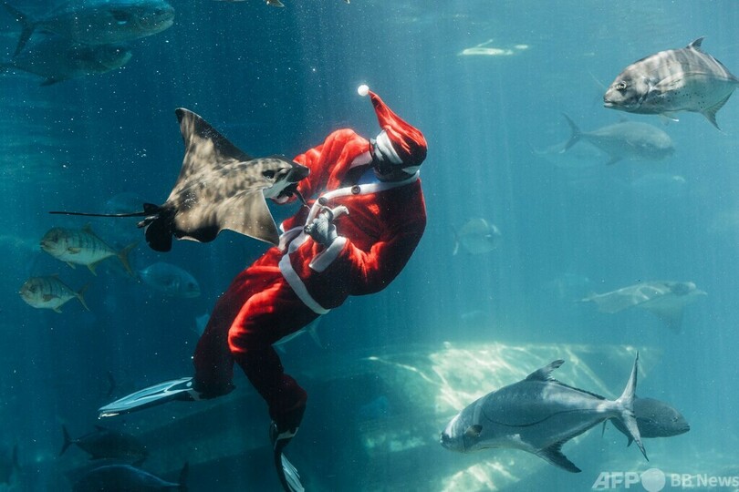 水族館のセンゾ・グメデさんらが扮(ふん)するサンタクロースが、水中でエイなど海洋生物にプレゼントの餌を与えた。