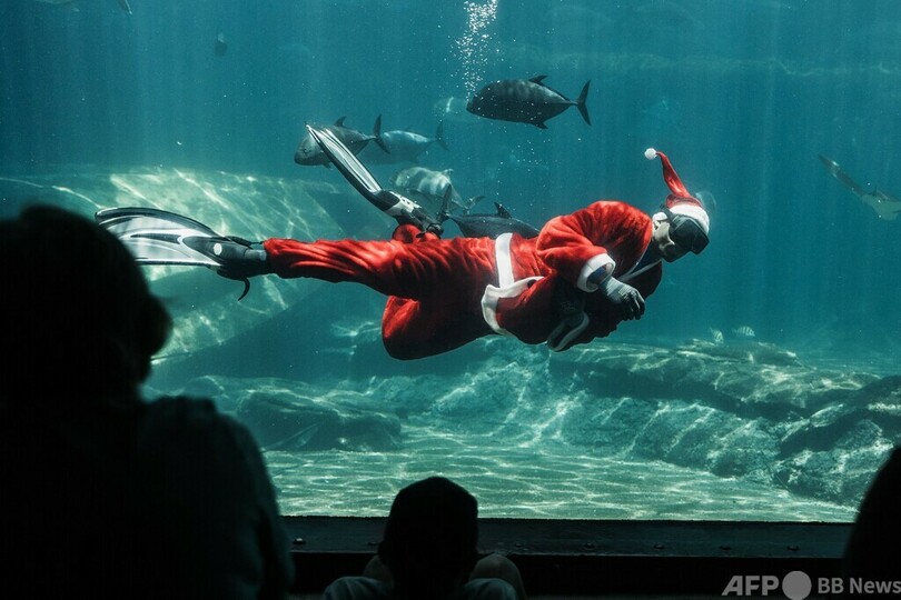 水族館のセンゾ・グメデさんらが扮(ふん)するサンタクロースが、水中でエイなど海洋生物にプレゼントの餌を与えた。