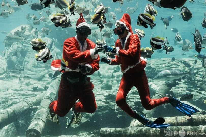水族館のセンゾ・グメデさんらが扮(ふん)するサンタクロースが、水中でエイなど海洋生物にプレゼントの餌を与えた。
