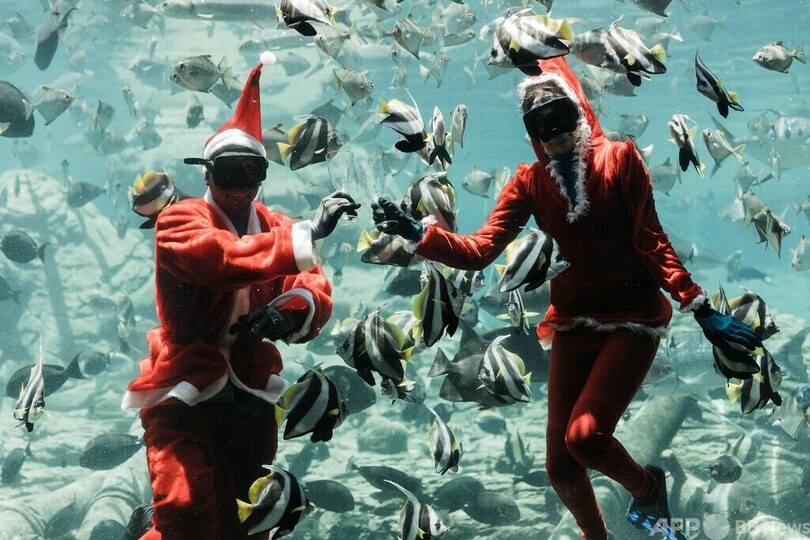 水族館のセンゾ・グメデさんらが扮(ふん)するサンタクロースが、水中でエイなど海洋生物にプレゼントの餌を与えた。