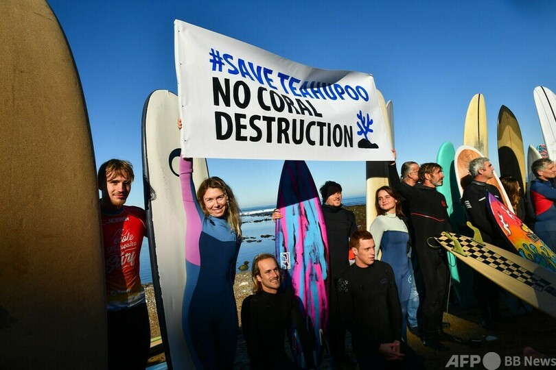 チョープーでのサーフィン競技実施をめぐっては、タワーの建設に使われる作業台船がテスト中にサンゴ礁の一部を破壊したことなどが問題となり、環境団体が猛反発。計画に反対するオンライン署名の数はこれまでに22万7000筆超に上っている。