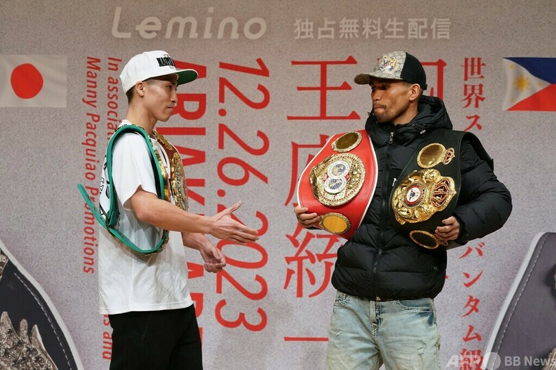 【12月25日 AFP】26日に東京・有明アリーナ(Ariake Arena)で開催されるボクシングの世界スーパーバンタム級4団体王座統一戦を控え、WBC、WBO同級王者の井上尚弥(Naoya Inoue)とWBA、IBF同級王者のマーロン・タパレス(Marlon Tapales、フィリピン)が24日、横浜市内で会見を行った。(c)AFP