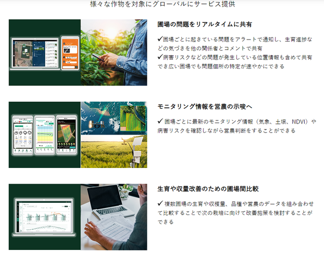 また、今回のプロジェクトと同様にICT技術を活用した農業ICTプラットフォーム「CropScope」も、高い評価を受けた取り組みの一つである。これは、さまざまな営農用のセンサーや衛星写真を活用することで農産物の生育状況や農園の環境を可視化するサービスと、AIを活用した営農アドバイスを行うサービスで構成されている。熟練者のノウハウを習得したAIが水や肥料の最適な量と投入時期を指示するため、農業従事者の技術の巧拙に関わらず安定した収穫と栽培コストの低減が期待でき、地球環境に優しい農業を実践できる。このサービスはすでにインド以外でもオーストラリアやブラジル、ベトナム、コロンビアなど世界11か国で実証され、トマトやジャガイモ、トウモロコシ、小麦やスパイス、大豆など多品種で結果を出している。