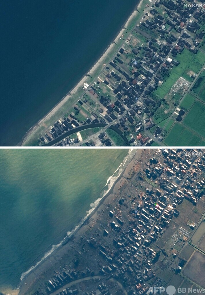 【1月3日 AFP】1日に発生した能登半島地震の被災地の地震前後の様子を捉えた衛星画像が2日、宇宙技術会社マクサー・テクノロジーズ(Maxar Technologies)により公開された。