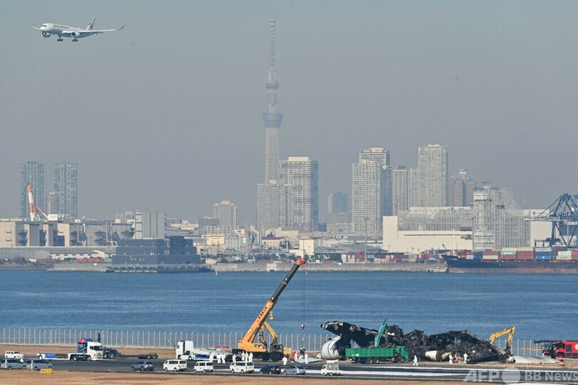 【1月5日 AFP】東京国際(羽田)空港(Haneda Airport)の滑走路で日本航空(JAL)の旅客機と海上保安庁の航空機が衝突した事故で5日午前、炎上した日航機の撤去作業が開始された。