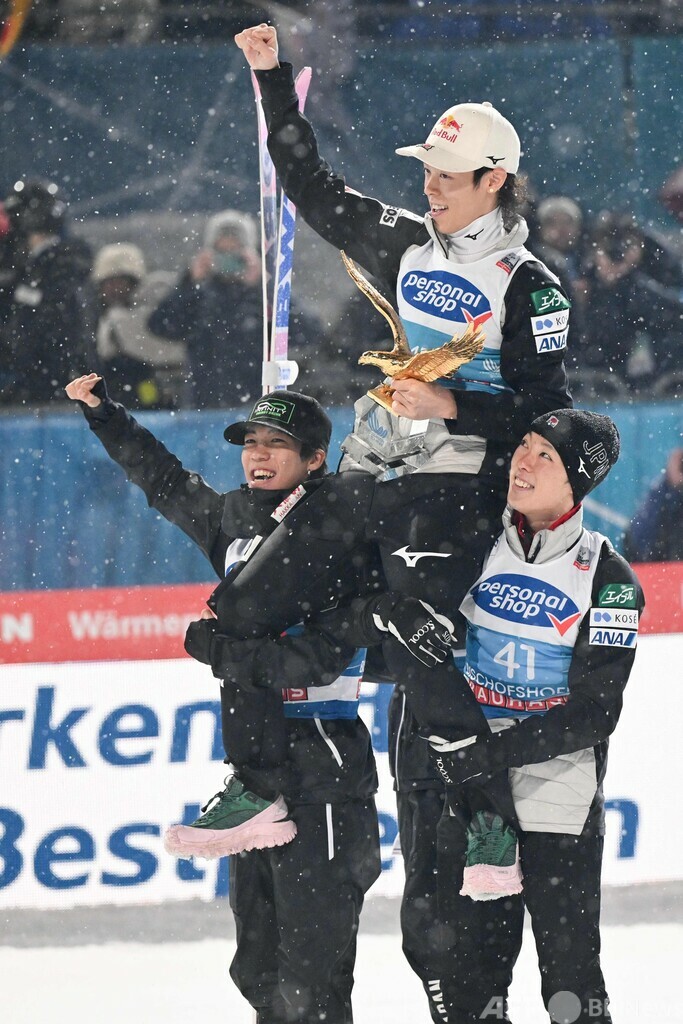 今季のジャンプ週間は、4戦すべてで異なる選手が優勝し、小林はいずれも2位だった。1位を獲得せずに総合優勝を達成するのは、1999年のアホネン以来となる。(c)AFP