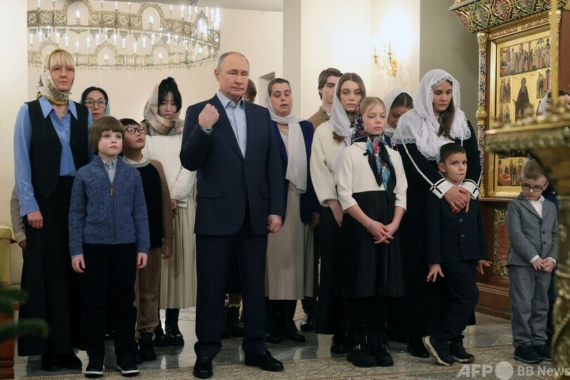 7日はロシア正教のクリスマスに当たり、前夜には礼拝が行われる。プーチン氏もモスクワ郊外ノボオガリョボ(Novo-Ogaryovo)の教会で行われたクリスマス礼拝に、兵士の家族らと共に出席した。