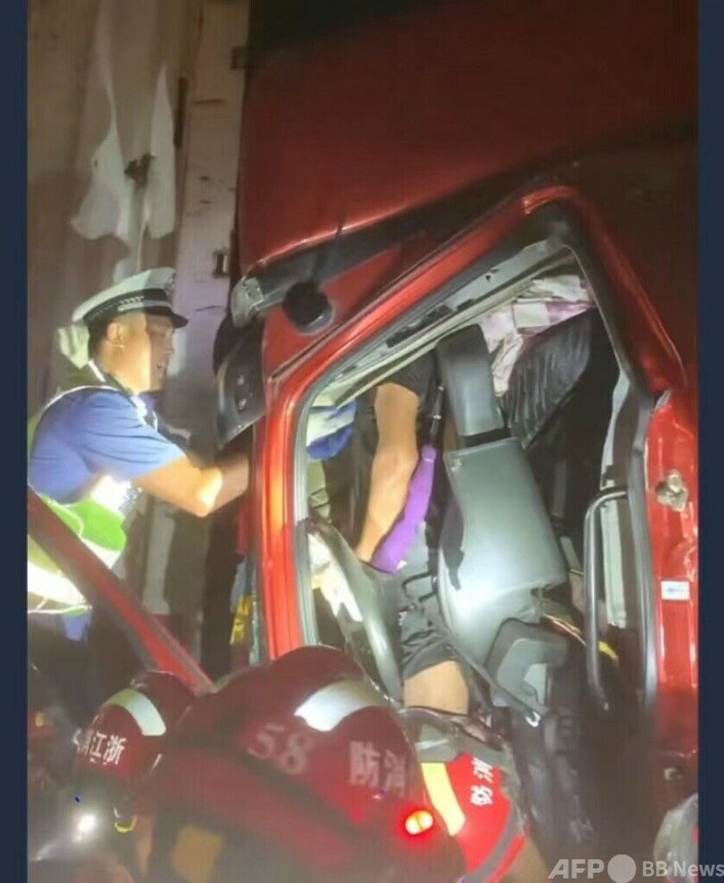 2023年9月11日未明、王さんが運転していたトラックは浙江省の寧波と広東省の東莞を結ぶ甬莞高速道路の銭庫区間を通過した際に交通事故が発生し、王さんは車内に閉じ込められてしまいました。通報を受けた高速道路パトロール担当の金さんが直ちに隊員と共に現場に向かいました。トラックの先端部分がひどく押しつぶされて変形し、運転手の王さんは血まみれになっていました。金さんはすぐに隊員を手配して通行車への警戒の提示をおこなうとともに、運転手の救助に当たり、トラックのフロントガラスを素手で壊すと同時に、窓を力強くたたいて、「運転手さん、分かりますか。寝ないでね、寝ないで!」と大声で呼び掛けました。