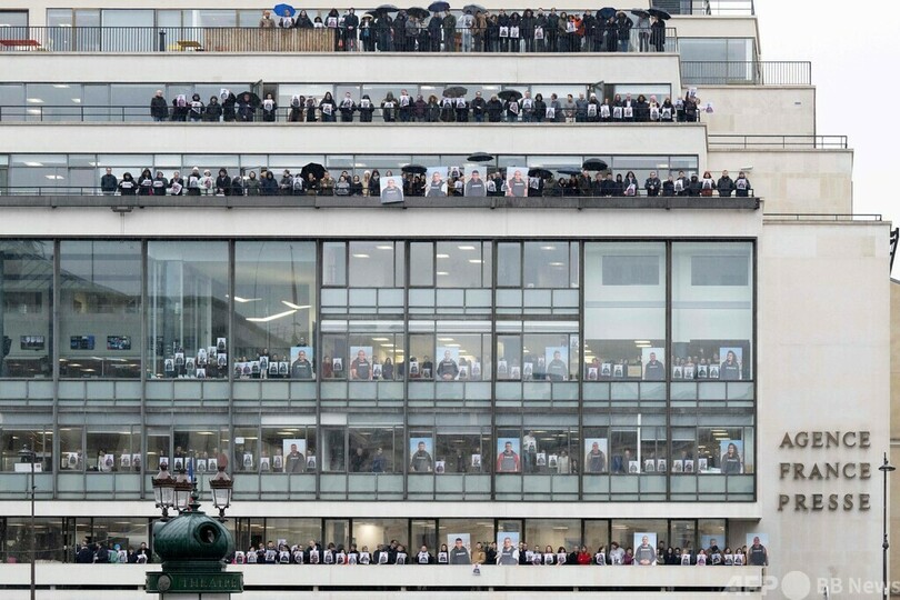 【1月29日 AFP】パレスチナ自治区ガザ地区(Gaza Strip)で取材をしているAFP通信(Agence France-Presse)のジャーナリストを支えようと、彼らの写真を掲げて同通信のパリ本社屋のバルコニーや窓に立つスタッフら。(c)AFP