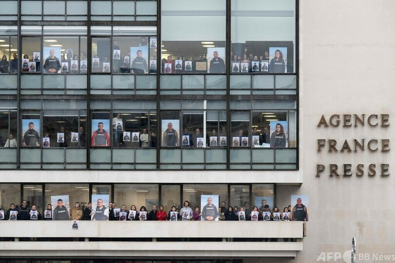 【1月29日 AFP】パレスチナ自治区ガザ地区(Gaza Strip)で取材をしているAFP通信(Agence France-Presse)のジャーナリストを支えようと、彼らの写真を掲げて同通信のパリ本社屋のバルコニーや窓に立つスタッフら。(c)AFP