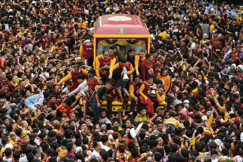 【1月23日 AFP】恒例の「ブラックナザレ祭」が開かれたフィリピン・マニラで、黒いキリスト像を覆ったガラスケースにキスをするカトリック信者。この祭りは世界有数の宗教的な催しの一つとして知られ、首都の通りを進むキリスト像に数十万もの信者が群がり、信心を示す。(c)AFP