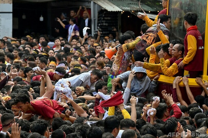 【1月23日 AFP】恒例の「ブラックナザレ祭」が開かれたフィリピン・マニラで、黒いキリスト像を覆ったガラスケースにキスをするカトリック信者。この祭りは世界有数の宗教的な催しの一つとして知られ、首都の通りを進むキリスト像に数十万もの信者が群がり、信心を示す。(c)AFP
