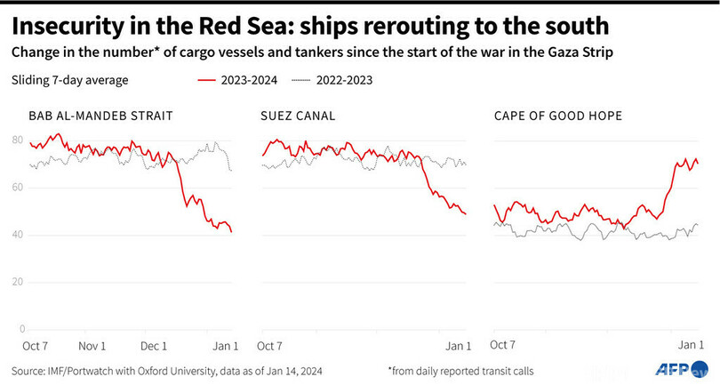 フーシ派はパレスチナ自治区ガザ地区(Gaza Strip)の住民への連帯を掲げ、商船への攻撃を繰り返しており、一部の海運企業は紅海の航行を控えている。