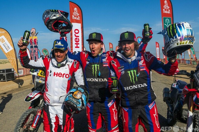 二輪部門では、モンスターエナジー・ホンダ(Monster Energy Honda)のリッキー・ブラベック(Ricky Brabec、米国)が総合優勝を飾った。ヒーロー・モトスポーツ・チーム・ラリー(Hero MotoSports Team Rally)のロス・ブランチ(Ross Branch、ボツワナ)が10分53秒差の2位に続き、ホンダのアドリアン・ファン・ビベレン(Adrien Van Beveren、フランス)が3位で初の表彰台に上った。(c)AFP