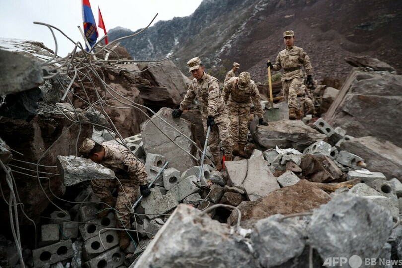 ニュース 社会 中国雲南省で土砂崩れ、8人死亡 数十人生き埋め 2024年1月23日 12:14 発信地:北京/中国 [ 中国 中国・台湾 ] このニュースをシェア ‹ › ❮ 6/8 ❯ 中国南西部・雲南省で起きた土砂崩れ現場で行方不明者の捜索に当たる兵士(2024年1月22日撮影)。(c)AFP 画像作成中 ! 【1月23日 AFP】中国南西部・雲南(Yunnan)省鎮雄(Zhenxiong)県の山岳地帯で22日未明、土砂滑りが発生して数十人が生き埋めになり、8人の死亡が確認された。 国営中国中央テレビが同日午後5時30分ごろに伝えた情報によると、家屋18戸が土砂に埋まり、200人超が避難した。 これまでに8人が死亡、4人が救助されたが、容体は明らかになっていない。 国営新華社通信は、夜になって冷え込む中、数十人が依然がれきの下敷きになっていると報じた。(c)AFP 社会 一覧へ> メディア・報道関係・法人の方向け 写真・動画 購入のお問合せ>