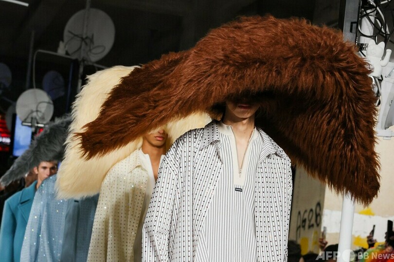 【1月31日 AFP】パリ・ファッションウィーク(Paris Fashion Week)で、ブルーマーブル(Bluemarble)2024年秋冬コレクションのメンズウェアの新作をまとったモデル。フランス・パリで。(c)AFP