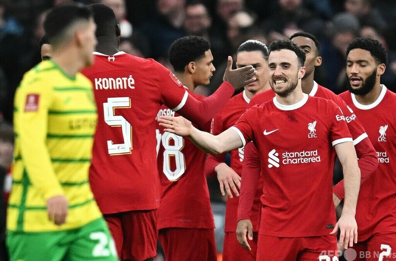 【1月29日 AFP】イングランドFAカップ(FA Cup 2023-24)は28日、4回戦が行われ、リバプール(Liverpool FC)は5-2でノリッジ・シティ(Norwich City)を下し、今季限りでの退任が発表されたユルゲン・クロップ(Jurgen Klopp)監督を4冠で送り出す可能性をつないだ。