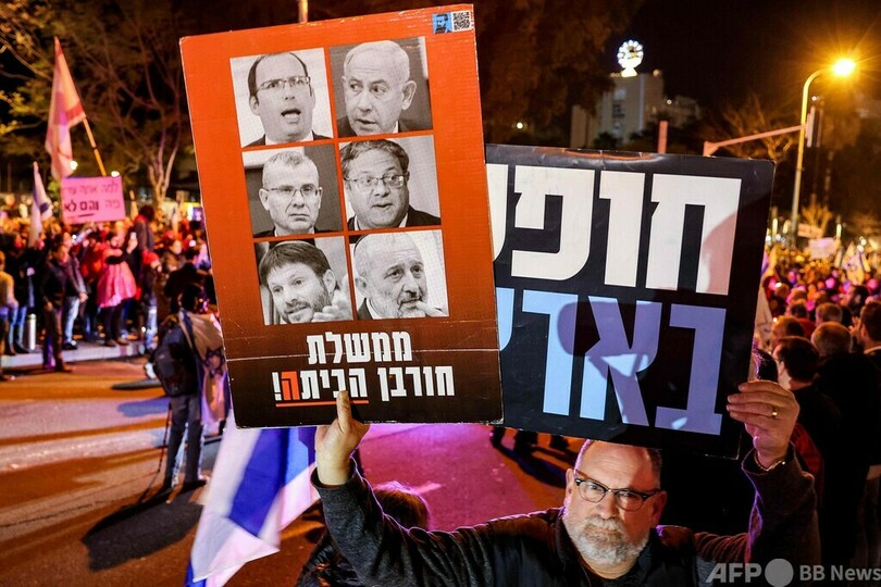 ネタニヤフ氏とヤリブ・レビン(Yariv Levin)法務相、イタマル・ベングビール(Itamar Ben Gvir)国家治安相、ベツァレル・スモトリッチ(Bezalel Smotrich)財務相らの写真に「祖国破壊内閣」と書かれたプラカードを掲げる参加者もいた。