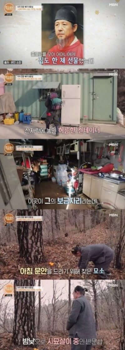 家を出たパン・ムンソプは樹木葬にした母親の墓のそばに5坪余りのコンテナボックスを用意し、生活保護を受けて暮らし始めた。コンテナの中には炊事道具をはじめ生活用品が一通りそろっているといい「生活に不便はない」と話した。