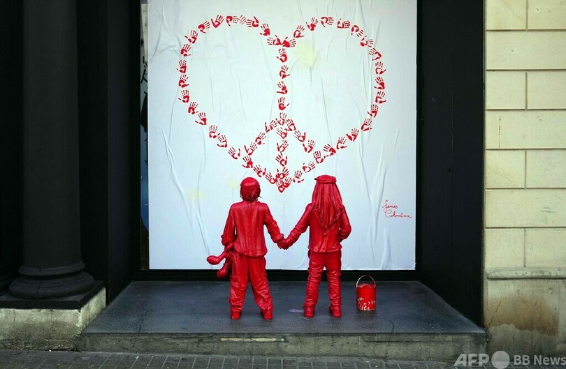 2人の子どもの体は真っ赤に塗られ、ピースマークも赤い手形で描かれたハート型になっている。(c)AFP