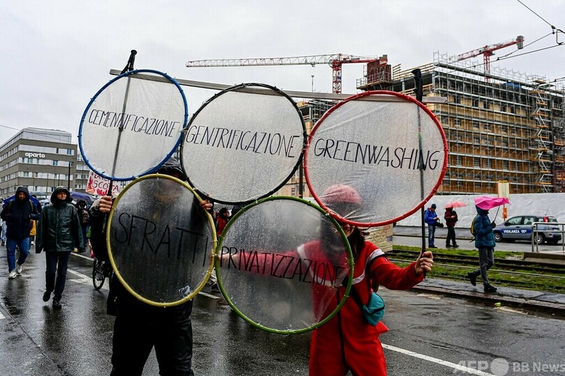 雨が降る中、参加者は圧力団体「持続不能な五輪委員会(Unsustainable Olympics Committee)」やハイカーのネットワーク、環境活動家、文化財保存協会、左翼団体の主導でミラノ市街を行進。物議を醸しているボブスレーのコースなど、大会へ向けたインフラ整備に反対した。各団体は、五輪がイタリアの山岳やミラノの住宅費に悪影響を及ぼすと訴え、前週も小規模な抗議を行っていた。